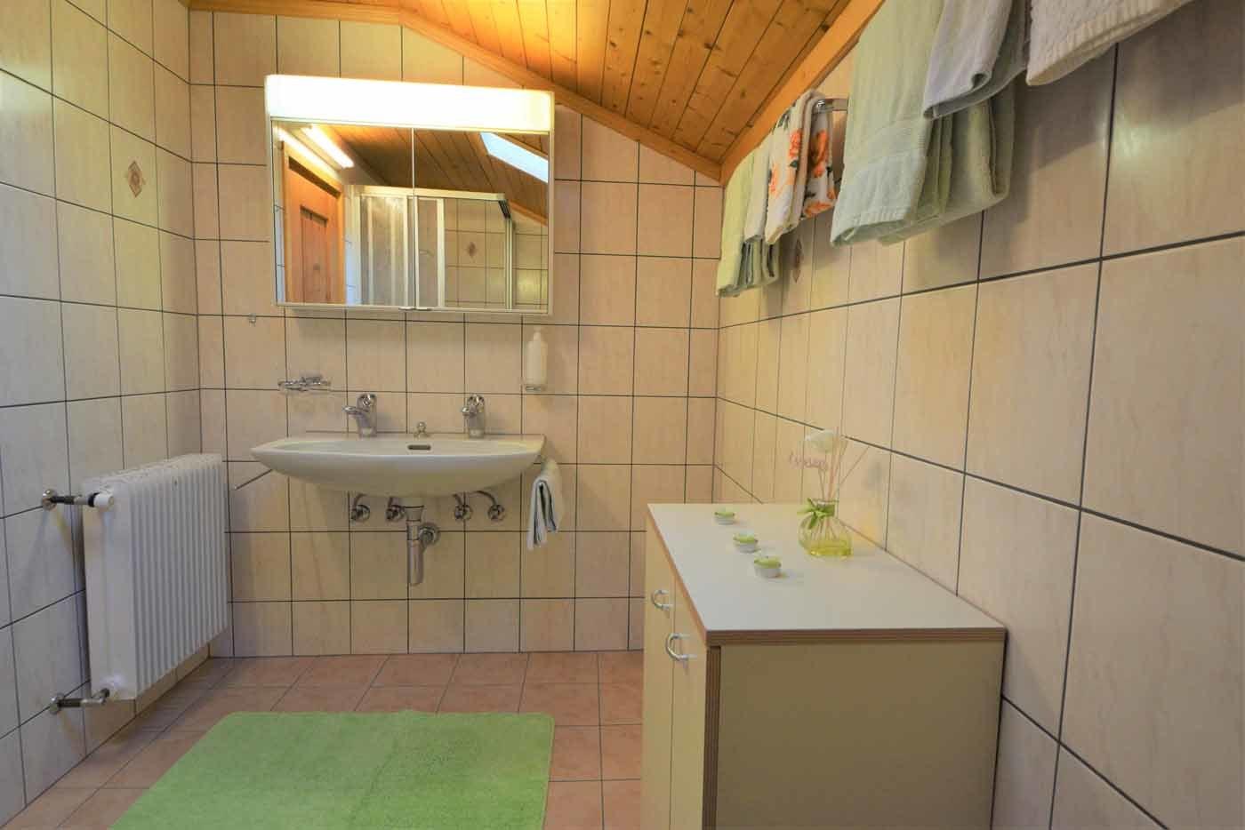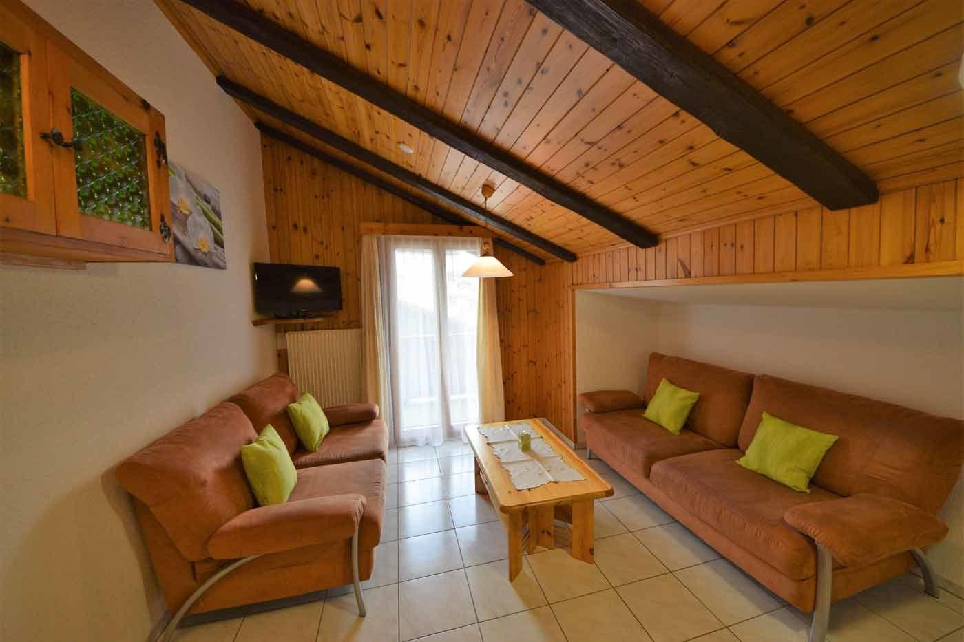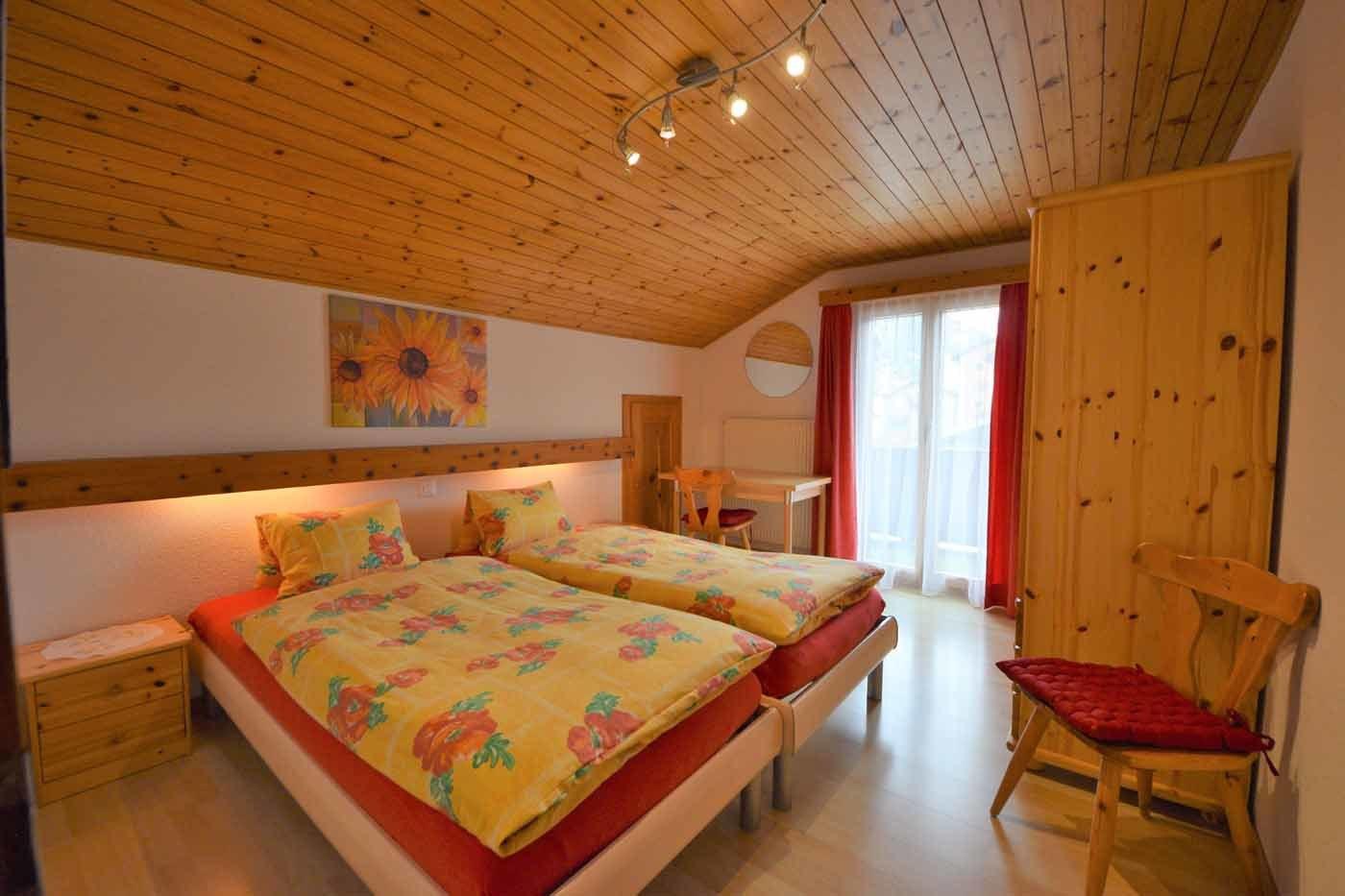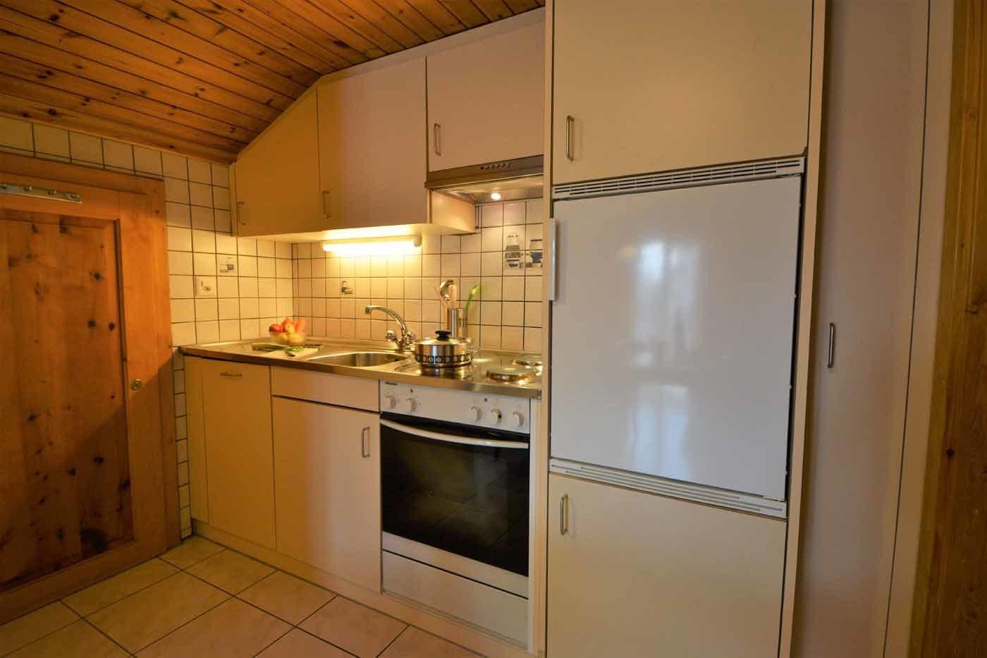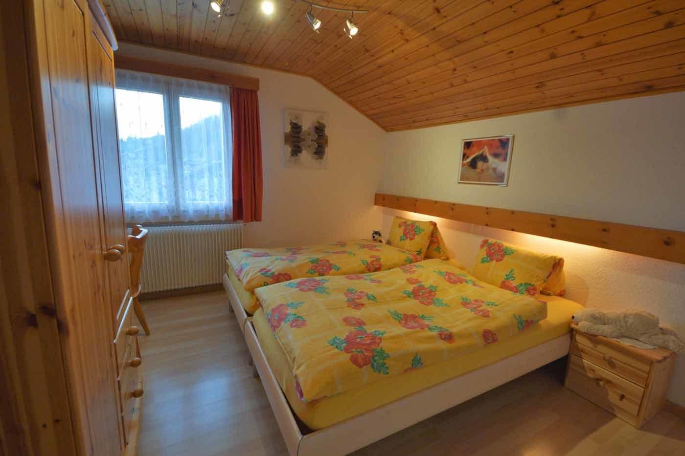Die Dachwohnung verfügt über: 2 Doppelzimmer mit je 2 Betten. Im Weiteren steht Ihnen eine offene gut eingerichtete Küche mit elektrischem 3-Plattenherd, Backofen sowie Kühlschrank mit Gefrierfach (Geschirrspüler, Toaster, Raclette- und Fondueset, Filterkaffeemaschine, Wasserkocher), Essecke und Wohnzimmer zur Verfügung. Auf den gemütlichen Sofas können Sie fernsehen oder einfach nur die Seele baumeln lassen. Das Badezimmer ist mit Dusche / WC und Waschbecken mit Spiegelschrank eingerichtet. Auf dem Balkon mit Sitzgelegenheit können Sie das herrliche Bergpanorama bewundern. SAT-TV Flachbildschirm, gratis WLAN Zugang, Radio/CD-Player vorhanden.